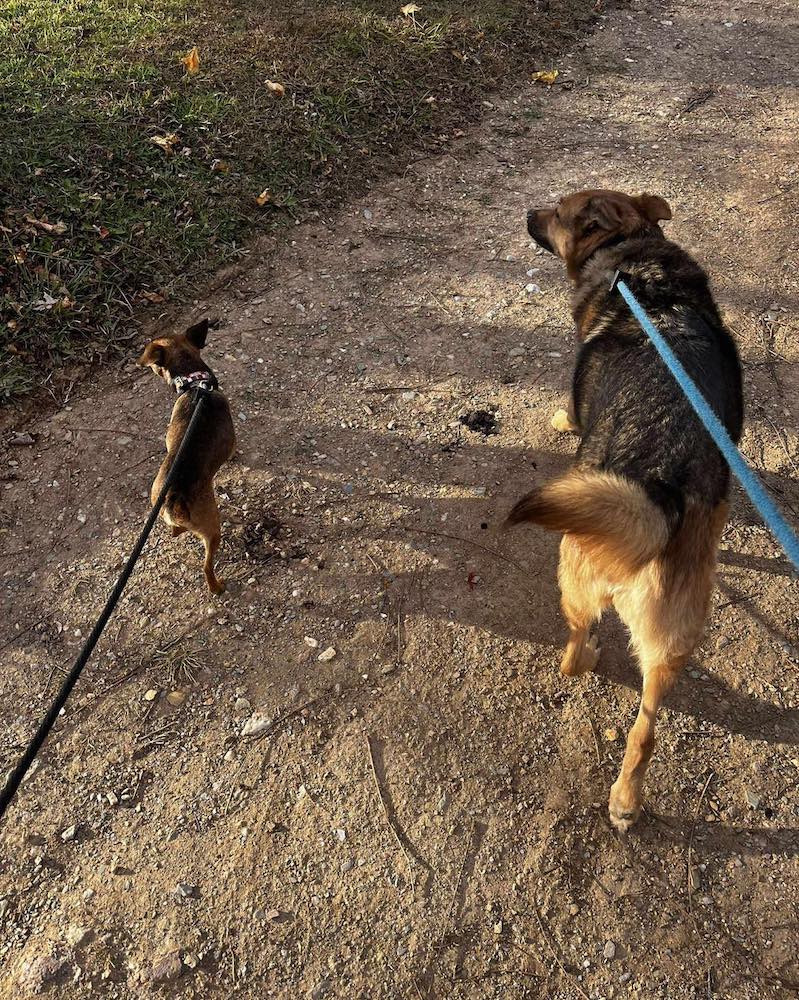 Morgan is as sweet as pecan pie — a gentle, loving senior girl with the kindest eyes and the softest spirit. She moves through life at a peaceful pace, happy to lean in for pets or nap the afternoon away. Milo, her little shadow, might be small but he has the heart of GSD. Devoted, spunky, and always keeping an eye on his big sister, Milo is a special little guy. Together, they make quite the pair — proof that love and loyalty come in all shapes and sizes.