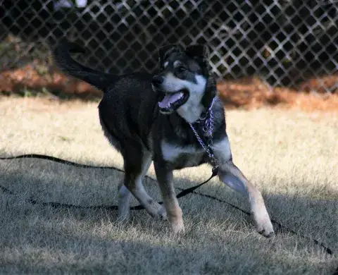 Harmony was found as a stray and ended up in a shelter. She is missing a rear paw which appears to be from an old injury. This does not slow her down, she can run and play as well as any 4 pawed dog. She is friendly and very much enjoys a good belly rub. Harmony will need training to help her overcome her dislike of vacuums, hairdryers, etc. This can be easily dealt with by putting her away when these items are in use and of course ongoing training. Harmony will make a loving companion for a very lucky family.