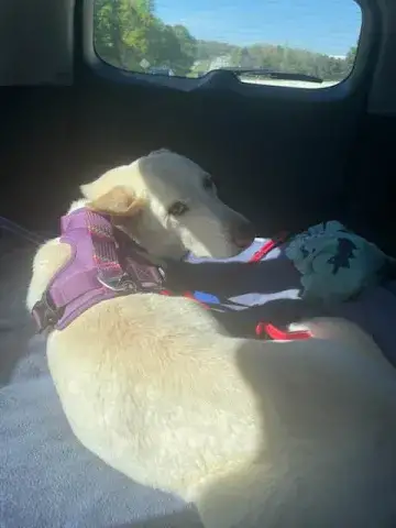 Maggie is doing very well learning basic obedience including sitting, walking on a leash, potty training while understanding what structure and boundaries are. She is always looking up for approval, and tiny motivational treats go a long way!”