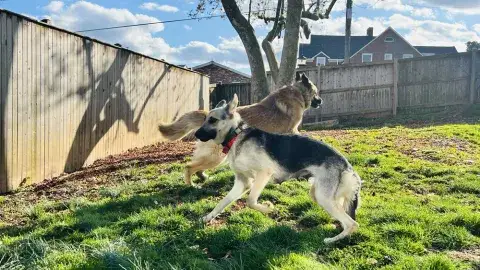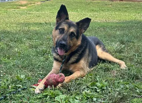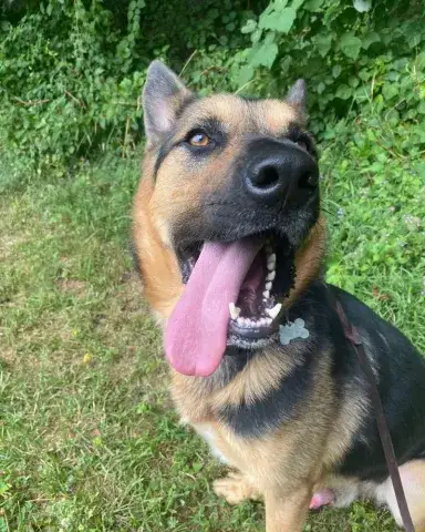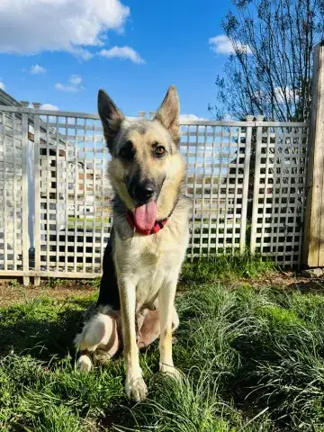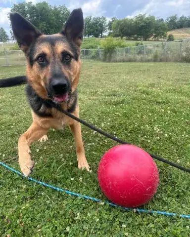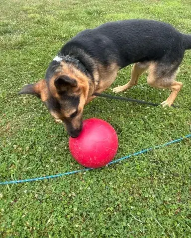 Kash is an outdoorsy guy. He loves the fresh air, freedom to run around, and the sunshine. A ball guy through and through, Kash is hardly ever found without a ball in his mouth or right next to him. Happy to chill with the ball, Kash keeps it close for security. However, he is beyond excited to play fetch with his people. He is hoping that his forever family is ready to keep their throwing arm in good shape. Comfortable with other dogs, Kash has been well-socialized. He is most comfortable with his buddy, Kai, and wouldn't mind resettling in a home with his partner in crime. Having lived in a GSD savvy home, Kash has learned the ins and outs of living in a household. He is house-broken and crate trained. He will even help you keep things clean, as dirty clothes are his one vice. True of all new dogs, Kash will need time to adjust to his forever family. With structure, routine, leadership, and daily activities, Kash will thrive. Training will be key to his success. Although he already knows some basics, training will help Kash develop a strong and healthy bond with his forever family. In addition, it will help him develop the skills he needs to become a good canine citizen.