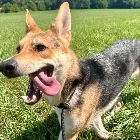 Stunning Spizike was picked up as a stray and brought to a shelter that was significantly over capacity. Waiting for her forever family, Spizike was placed on a stray hold. Although timid in the crowded shelter, staff could see this girl was special. When volunteers got her out and about for breaks from her kennel run, Spizike's personality simply shined. She relaxed, showed her playful side, and quickly proved that she was an amazing dog. Everyone was hoping that this sweetheart's family would step forward to claim her. Unfortunately, no one stepped forward. With so many other dogs to compete with for placement, Spizike's chances of finding a safe and loving forever home began to decline. Knowing that shepherds are most successful when placed within a breed specific rescue, one of the shelter coordinators reached out to MAGSR for help. They knew if given the chance, Spizike would be a perfect match for an active home. Our team knew Spizike was the right fit, so we immediately welcomed her to the MAGSR family.