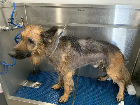 Ranger had untreated skin issues that had caused a lot of hair-loss, flaking, and itchiness. It is believed that everything began with an allergy that when untreated and resulted in a secondary yeast/fungal infection that got out of hand. He has been given a course of antibiotics, steroids, and medicated baths which have already begun to have a positive impact. In addition to skin issues, sweet Ranger also had significant bilateral ear infections that have since been treated. Although his appearance may not match his impressive personality right now, we fully expect him to regrow his lovely coat.