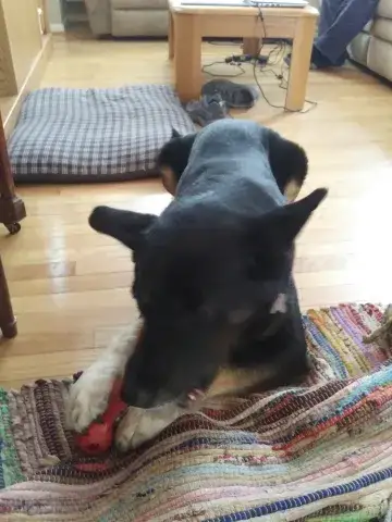 King is a handsome, happy-go-lucky two year old purebred GSD that draws his security and confidence from his ten year old Jack Russell Terrier brother Duke! Just as King depends on Duke, Duke, who is blind, depends on King to guide him through life. This pair is not only bonded, but they are absolutely dependent on one another. They thrive together.