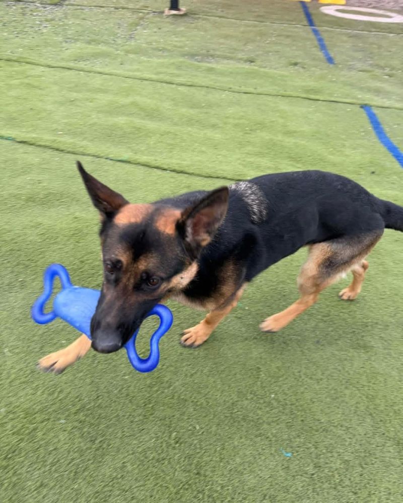 When Saxom recently needed to come back to us, our team made sure he had a safe and loving foster home waiting. Upon his return, it was discovered that he had developed perianal fistula, a chronic inflammatory condition more common in German Shepherds. While this condition requires ongoing care and daily medication, our amazing team and his devoted foster family are committed to keeping Saxom comfortable and happy. Despite his medical needs, Saxom’s joyful spirit shines through every day. He loves his toys — especially his ball — and his foster family keeps the toy basket well-stocked to make sure playtime is never missed. As a senior gentleman, he enjoys a good balance of fun and rest, curling up on a cozy bed for pets and relaxation between play sessions.