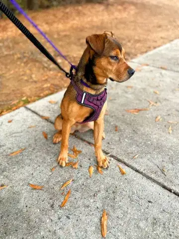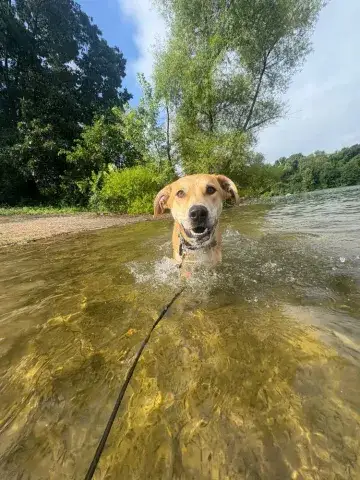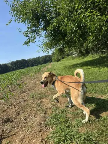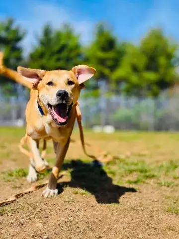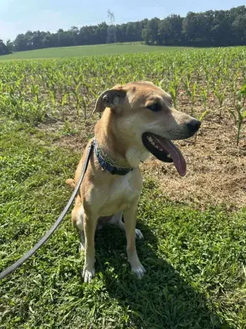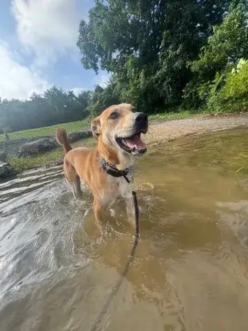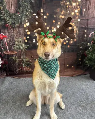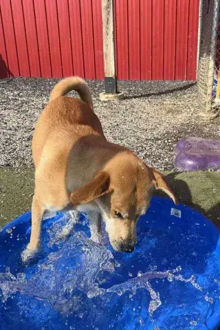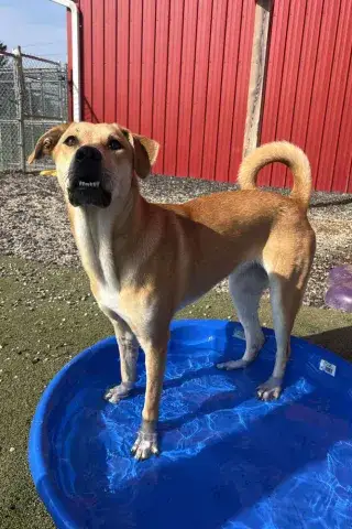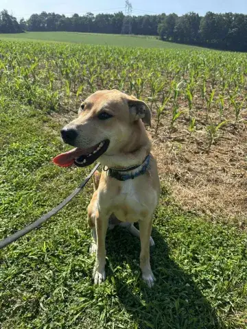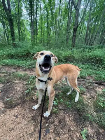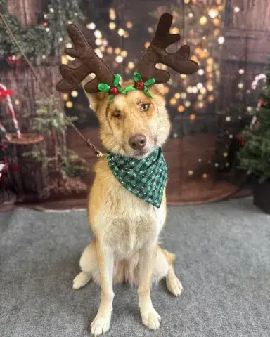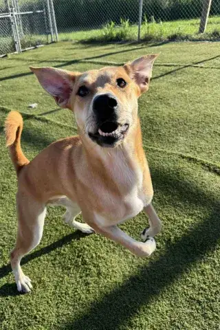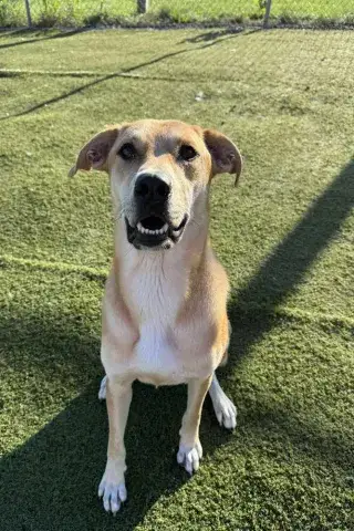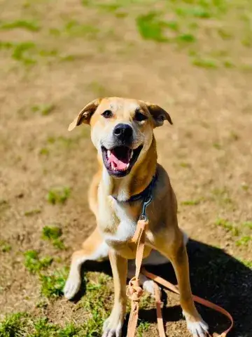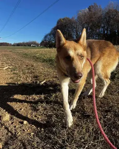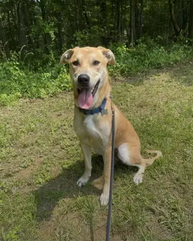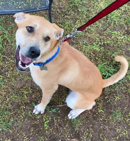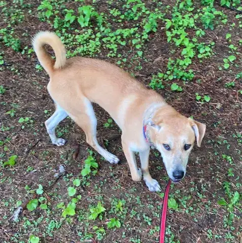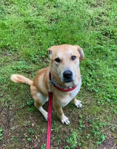 Sage is a beautiful young dog with a soft caramel-colored coat and an even sweeter personality. Just under a year old when she entered her temporary foster home in the South, Sage was underweight but incredibly affectionate. With full meals, a soft bed, and a consistent routine, she quickly began to thrive. It became clear that Sage already had some important skills—she is social, walks well on leash, and loves to lean in for cuddles. Though her past is unknown, it’s obvious someone showed her kindness along the way. She is comfortable with people and other animals, and while she occasionally needs redirection when she gets a little too playful with the resident cat, she responds well to guidance.
