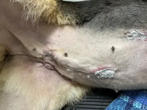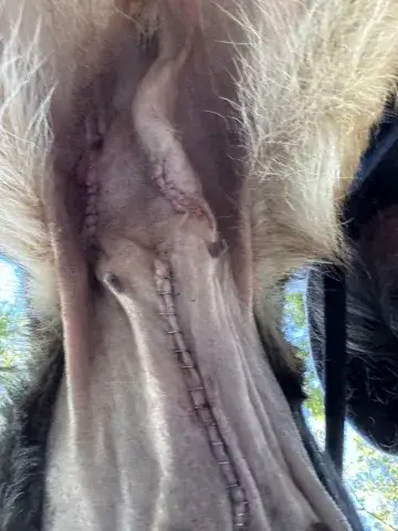 Ivy has been living with her foster family for a little over a month now, and in that time she has shown nothing but courage and gentle resilience. Under the care of one of our dedicated medical fosters, Ivy has spent the last few weeks recovering from her first major surgery. As she had several large incisions, her healing took a bit more time than expected. Additional antibiotics and Silvadene cream were prescribed, and Ivy - ever the patient, trusting girl - allowed her foster to clean her wounds daily, apply her creams, and rotate her surgical pajamas without complaint.With her first surgery and healing process successfully behind her, Ivy recently returned for a second procedure to remove additional tumors from her mammary glands and abdomen. Her incredible surgical team worked meticulously, ensuring clear margins, keeping her comfortable, and sending her back home to rest and recover with the same loving foster family. We cannot thank our veterinary partners enough for their commitment to Ivy's care and future. Now, with a long incision stretching from her chest to her abdomen, Ivy is back on crate rest and under close supervision as she continues the next phase of her recovery. We are eagerly waiting for her biopsy results and remain hopeful for good news. Most of all, we can't wait for Ivy to reach the point where she can fully enjoy the love, comfort, and joy she so deeply deserves. Team MAGSR could not have provided Ivy with this critical medical care without your generosity. Your donations, well-wishes, high-value treats, orthopedic beds, and ongoing support mean more than words can say. As Ivy continues to heal, we are asking for your continued donations and support so we can keep providing lifesaving care to her - and to the many other dogs with serious medical needs who are still waiting for their chance. It truly takes and village and Ivy is healing because of you.
