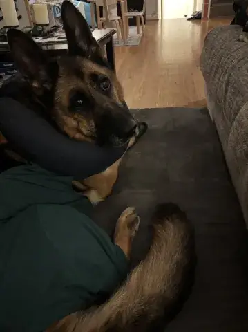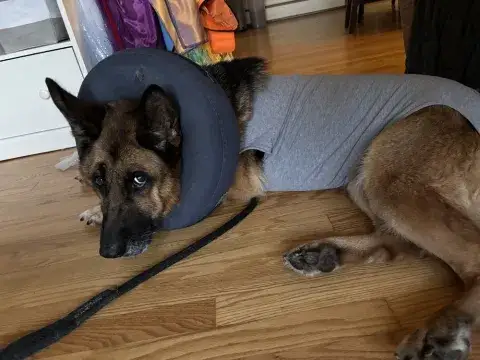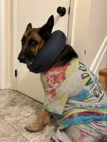 This week, Ivy bravely underwent a complicated hysterectomy, had several masses removed, and began treatment to address her discomfort. Radiographs of her joins and chest were taken to determine the extent of her needs. Consultations with specialists also took place. At this time biopsy results are pending, and more invasive care may be needed. Despite everything, Ivy remains calm, loving, and endlessly patient — a true testament to her spirit. She is wearing her surgical pajamas like a champ, is adjusting to the cone and pro collar, and has been very patient when going through daily clean up and care. Ivy isn’t available for adoption just yet, but she will be — once she’s strong, healthy, and ready for the next chapter of her life.