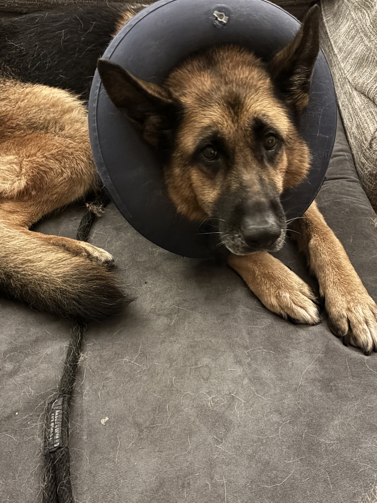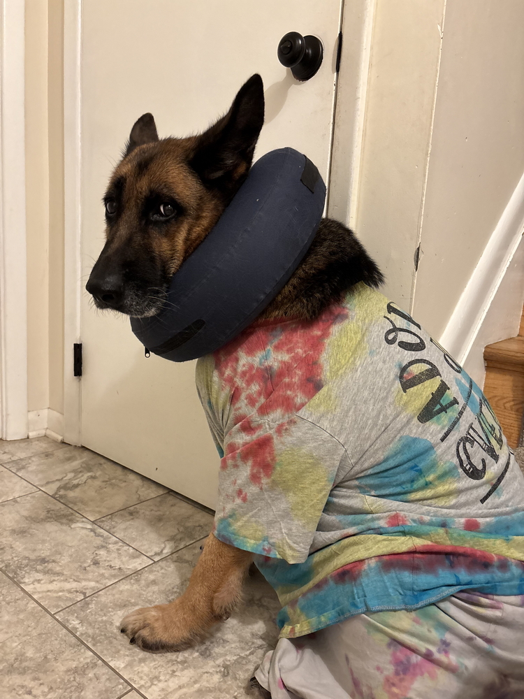 This week, Ivy bravely underwent a complicated hysterectomy, had several masses removed, and began treatment to address her discomfort. Radiographs of her joins and chest were taken to determine the extent of her needs. Consultations with specialists also took place. At this time biopsy results are pending, and more invasive care may be needed. Despite everything, Ivy remains calm, loving, and endlessly patient — a true testament to her spirit. She is wearing her surgical pajamas like a champ, is adjusting to the cone and pro collar, and has been very patient when going through daily clean up and care. Ivy isn’t available for adoption just yet, but she will be — once she’s strong, healthy, and ready for the next chapter of her life.
