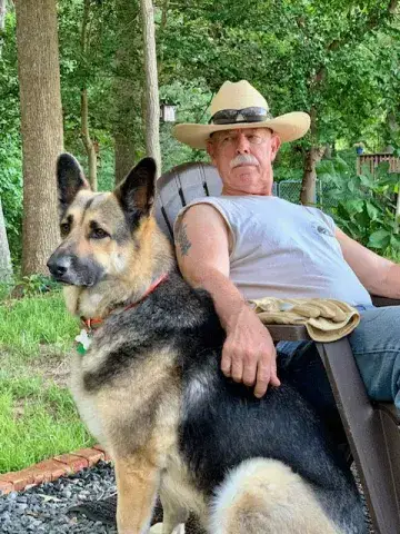 Our dog Jedi, whom we adopted from MAGSR in 2016, ran free over the Rainbow Bridge on December 16, 2022 after not enough years as a beloved member of our family. Jedi is loved in continuum by Valerie, Graeme, Ryleigh, and Todd who were blessed to have found a furry companion so loyal, loving, and playful until the last calling. We surrounded him as he passed over and never imagined being so in love with a beast both ferocious and cuddly. Jedi loved his ball playing more than anything and had to be outside to supervise all grass mowing activities involving the riding mower.  His daily treat regime evolved from showing off his paw control to racing Ryleigh to the couch and barking/yipping while sliding through the twisting route from kitchen to living room. Jedi often overpowered Graeme in frequent games of rope pull but I think both let the other win an equal amount of time without admitting to any purposeful losses. Jedi loved the creek and hated baths, he was a weirdo from start to finish.  Use the garden hose fill up his water bowl, or just say water in general and he would disappear. Mention the creek or start hiking through the woods and he would be in the water, over his head, trying to drag logs off the bottom before you could call him back. I'm not sure Jedi understood the creek is made of water, the same water he was so careful to avoid in any other circumstance, he didn't always utilize his rational brain.  He did learn how to unlock, and open, the sliding basement door so we are not entirely sure if he was a savant or simply a screwball. We are leaning savant as he learned how to spell the words we couldn't say without an excited reaction. We still can't believe he's not lying in wait for us to get out of bed, come back from an errand, or monitoring the four of us from a central position. We miss the clack of his nails on the floor, the pilling of GSD fur in all corners, under every piece of furniture, and winding up in every drink or dish prepared. None of us were ready for him to go but with two torn/bad knees and a late-stage cancer diagnosis we did everything we could to keep him at home with us from hand feeding to carrying him up the stairs when he couldn't get enough momentum to hop all the way up.  Jedi was the heart of our house and the void without him is longingly painful. Jedi was our everything, we love him endlessly and are thankful for the circumstances that brought him to us and angry for the circumstances that took him away. We are forever richer for having loved Jedi, and we know he is still with us, watching over us, forever our companion. Todd & Valerie Harshman