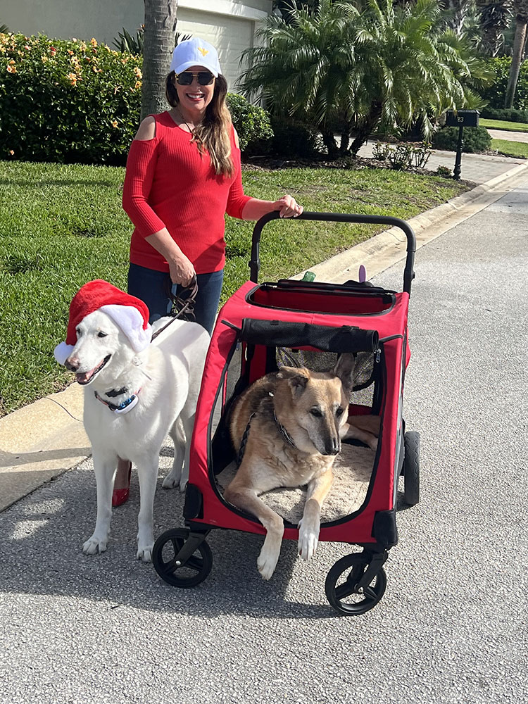 The picture is from last Christmas, and she is in her carriage, along with her adopted brother Klaus- the white shepherd we adopted from SWFLGSD Rescue. At that time, she was no longer able to take long walks, but enjoyed the ride.