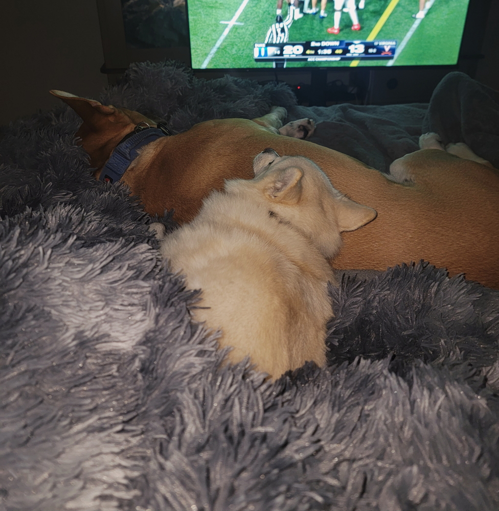 Jo just hit his gotcha day on March 15 and celebrated in style with vanilla ice cream. He’s the epitome of a little sibling keeping us all on our toes and providing endless snuggles. He loves to let off steam in the yard with all the zoomies and then chasing his brother Nick while he plays fetch. His favorite activity is sitting by the front window to keep tabs on what dogs are making their rounds in the neighborhood.