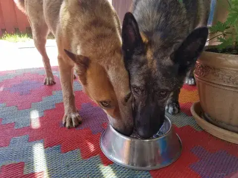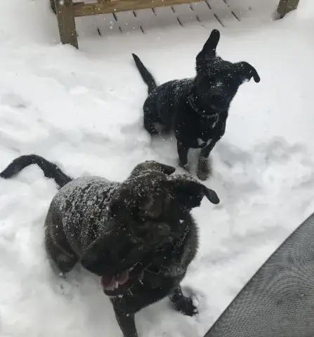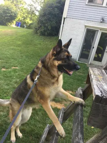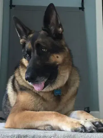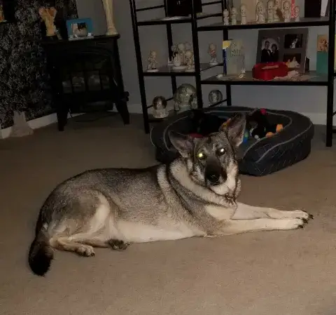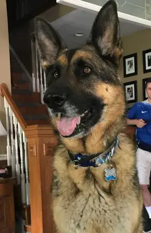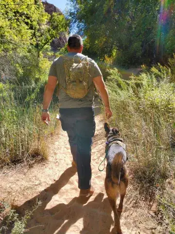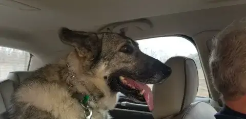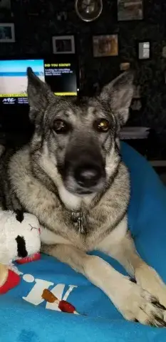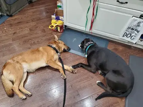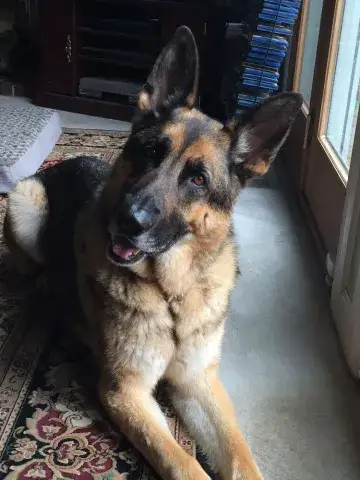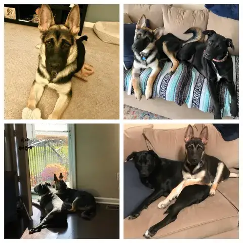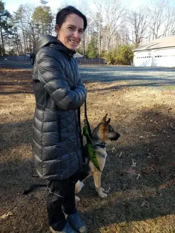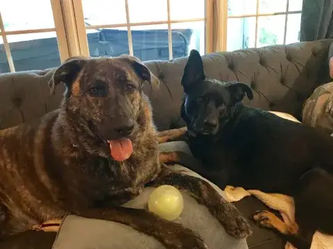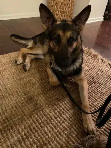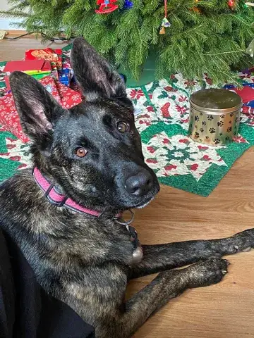 Johnny is not used to being in a house - poor guy.  He is learning how to do the stairs and learning how to potty train.  He’s doing great with so many new things.  Our five year old female GSD, Corporal, is showing him the ropes, lol.  He looks to her for guidance.  They did awesome yesterday walking the trails.  He found out what a ball is and loved watching her run for it.   He loves to eat and we gave him a treat last night that he absolutely enjoyed!  He does get nervous when he can’t see us, so we have very large crates in the living room and bedroom.  He did belly rubs with us last night and we were thrilled .   He tried out a dog bed today and playing with a stuffed lamb and loved it.  He walks slowly around the house since there are so many new things but we have a quiet household so I think that helps.   He’s going to go to the vet tomorrow just for a checkup and get established with the vet here.  He is also going to start his doggy training tomorrow evening at Blue Line K9.   We are so thrilled to have him and help him along, he will be celebrating his first Christmas with us....we were laughing when we put up our real tree last night.  He peed on it!!   Mike & Sara Walczak