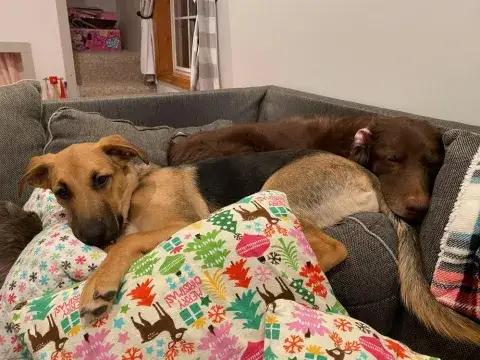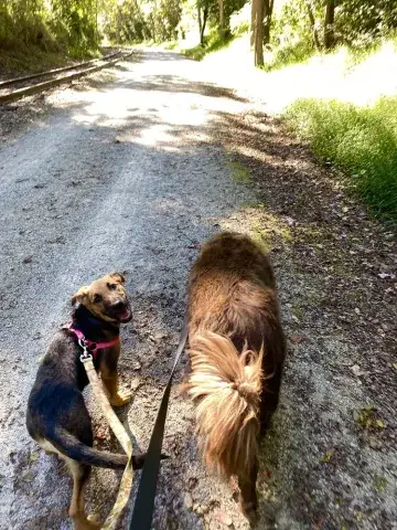 Dolly (aka Princess Bea) is definitely still a princess. She is happy and super energetic. She loves playing and cuddling with her big doggy brother Waylon and even has her gotten her big kitty sister Winnie to warm up to her. She loves playing tug a war with our daughter Maisie and chasing her around. She is very anxious around new people and places but has improved a lot with puppy classes and going on walks on the ncr trail. She has been a great addition to our family. We’re glad to have her.